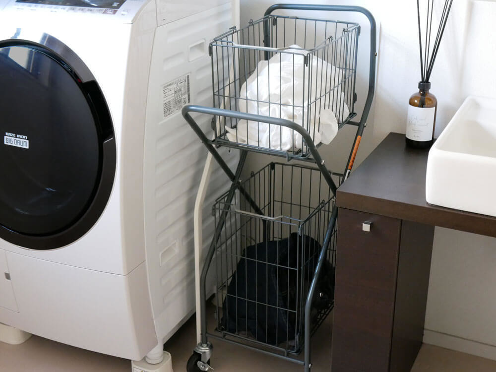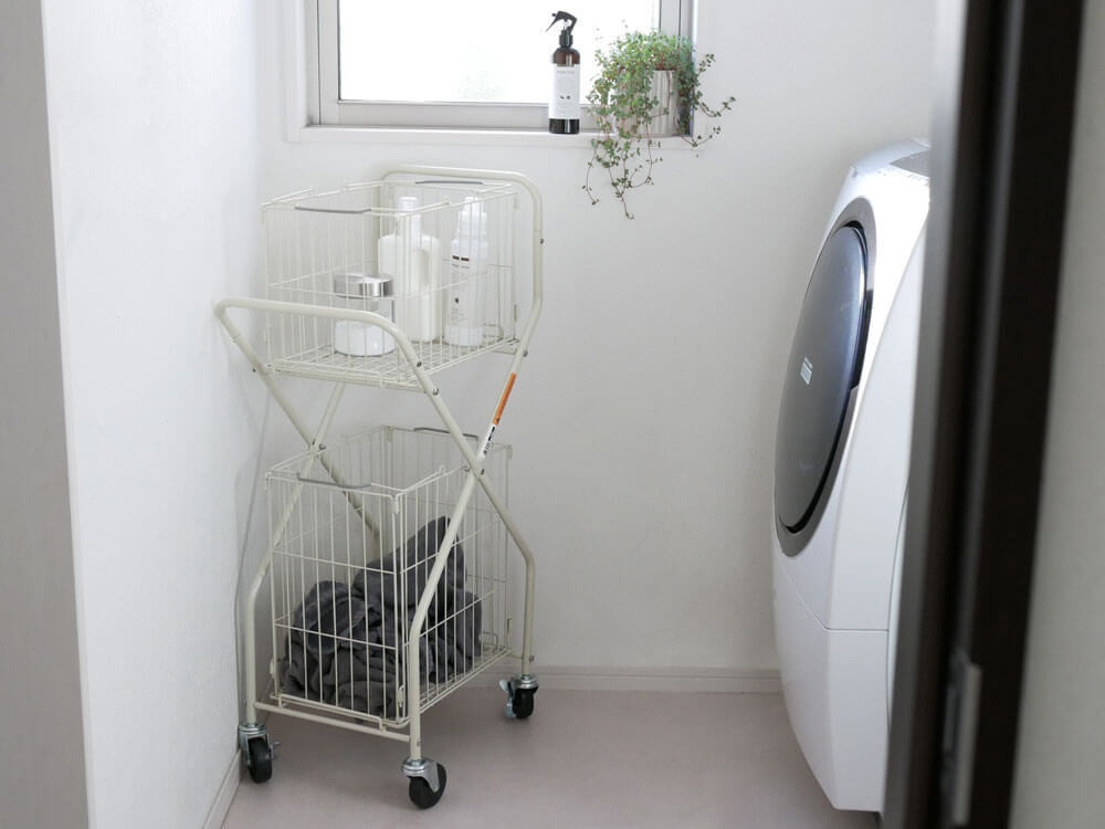 やんちゃ感ありながらも、もちろんちゃんと収納してくれる「ランドリー トローリー」。 洗面周りでは上段に洗剤類のストック、下段には洗濯物と仕分けができるのが便利。