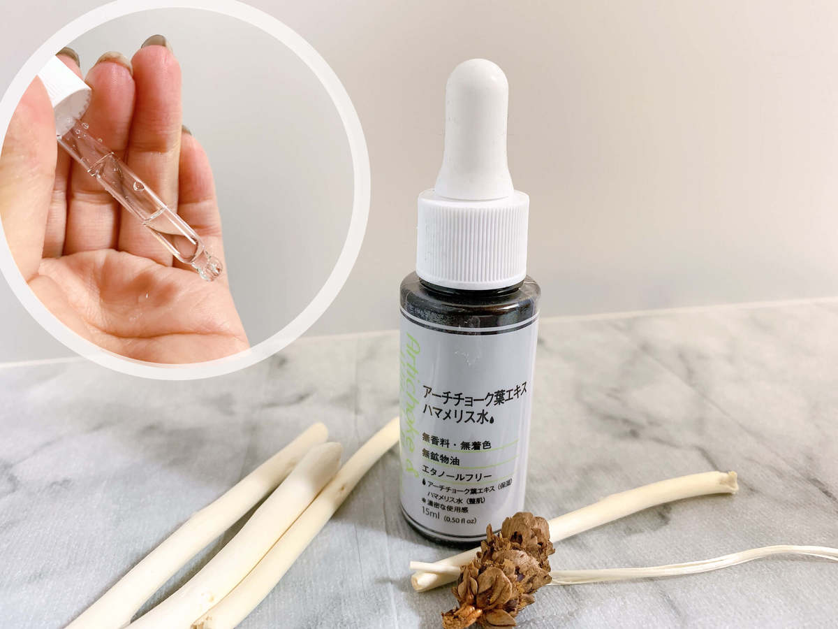 こちらは、ダイソーで大人気の美容液シリーズ「アーチチョーク葉エキス ハマメリス水」(110円 税込)。毛穴を引きしめて、ふっくらとハリのあるお肌に導いてくれるそう。