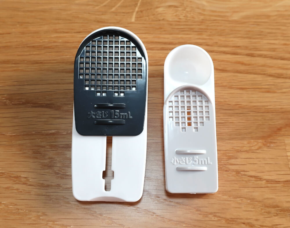 このスプーンのスゴイところは、すりきりが簡単になるだけじゃないんです。もう一つの特徴が、フタが網目状になっていること。