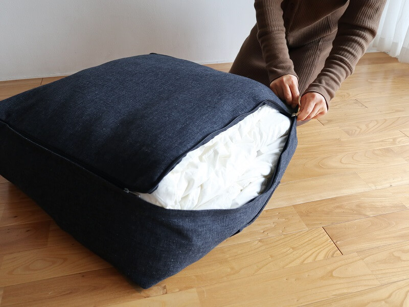 「生地も厚手で色味もお洒落で素敵です!使わない羽毛布団を入れて、寝室のマットレスベッドの足元に置いています。