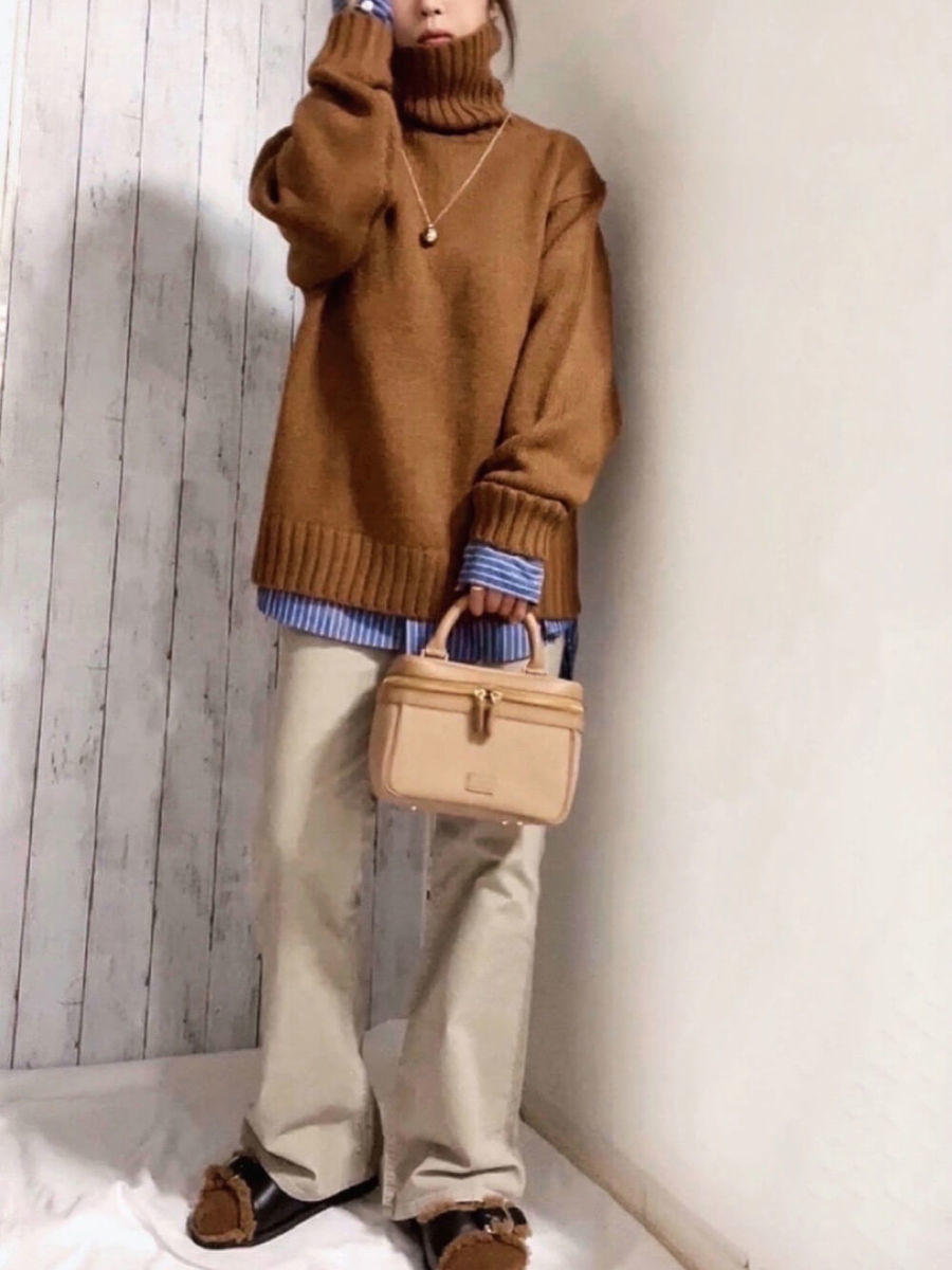 ベージュ×ブラウンのタートルニット×ブルーのストライプシャツ