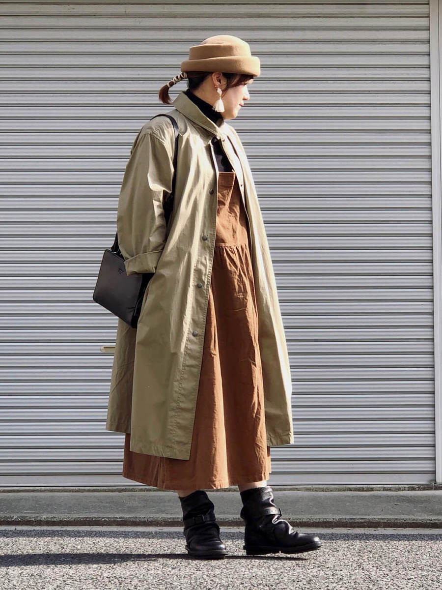 重めの色合わせはスカートや小物、アウターを明るめカラーにすると好バランス。