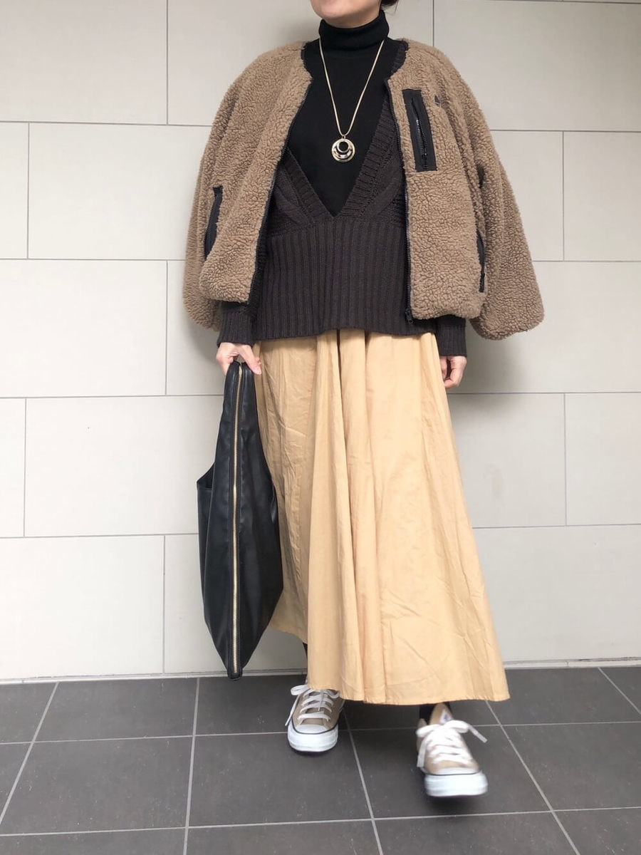 インナーのタートルと小物をブラックにすることで、ブラウンコーデを引き締めて。