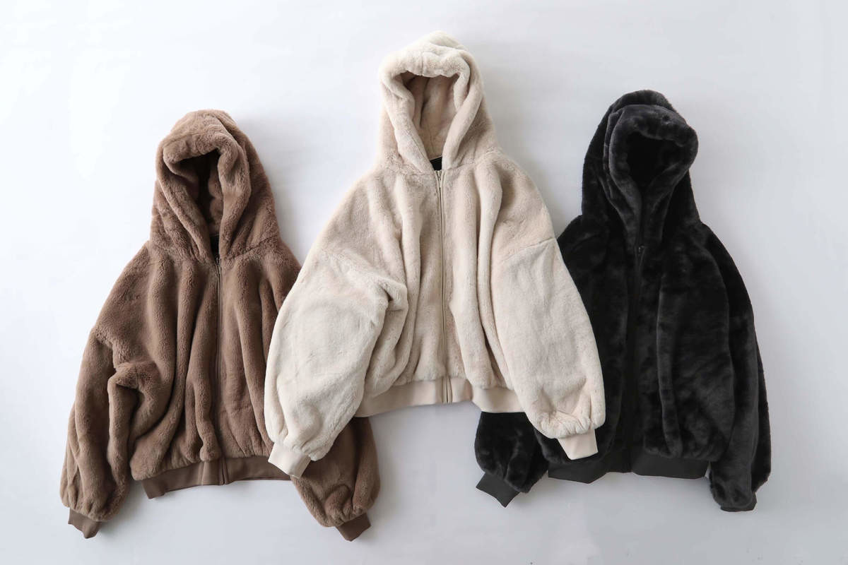 フードパーカーもくすみカラーの4色展開!フードの中までしっかり裏ボアになっていますよ。