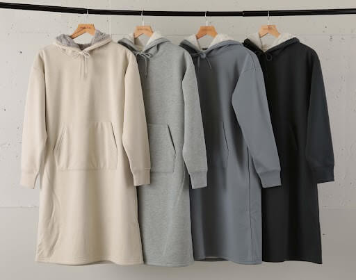 4色展開の裏ボアフードワンピース。おしりまですっぽり暖かいので、外出にもぴったり。