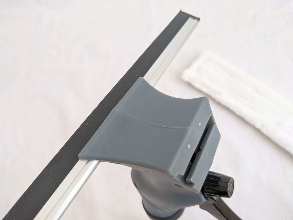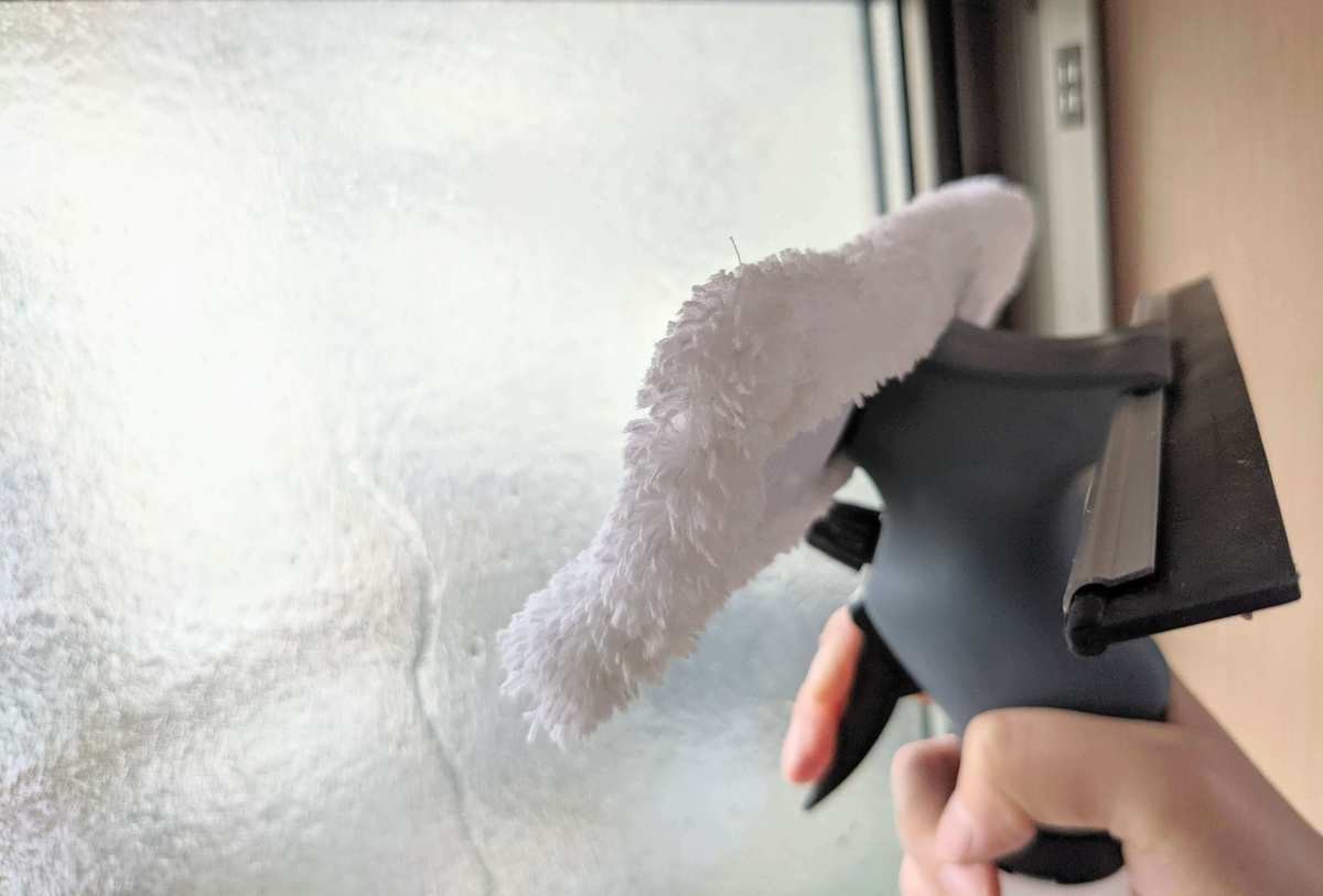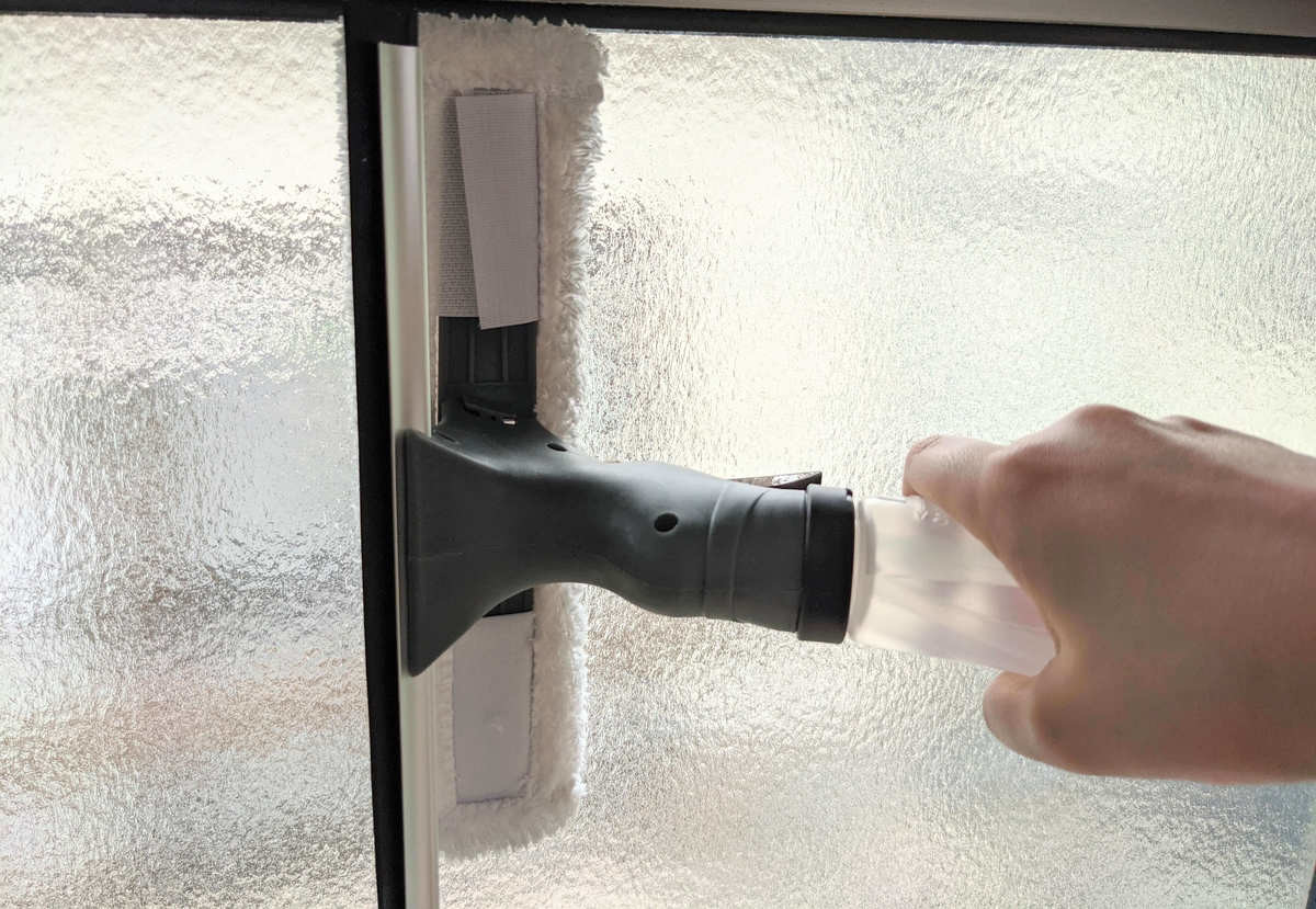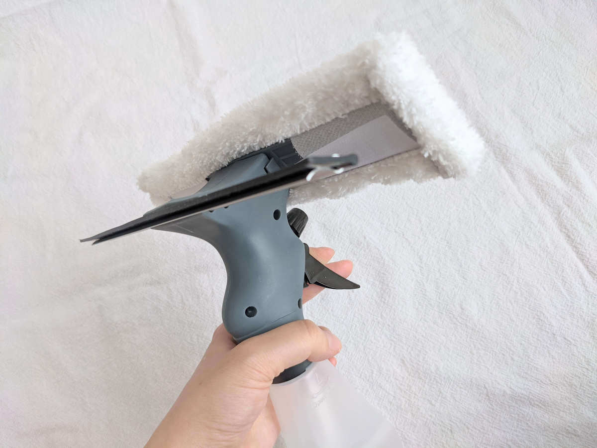 モップの下に霧吹きの噴射口があり、タンクに水を入れれば今すぐ窓掃除が始められます。