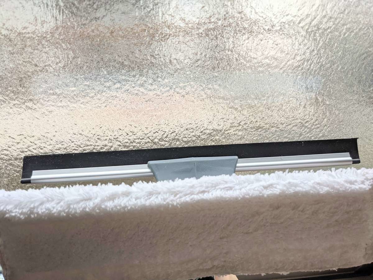 最後に、スクイージーを縦方向に一気に引き下ろし、窓に残った水を切ります。 窓ガラスの一番下の部分は、スクイージーを横にして水を切ります。