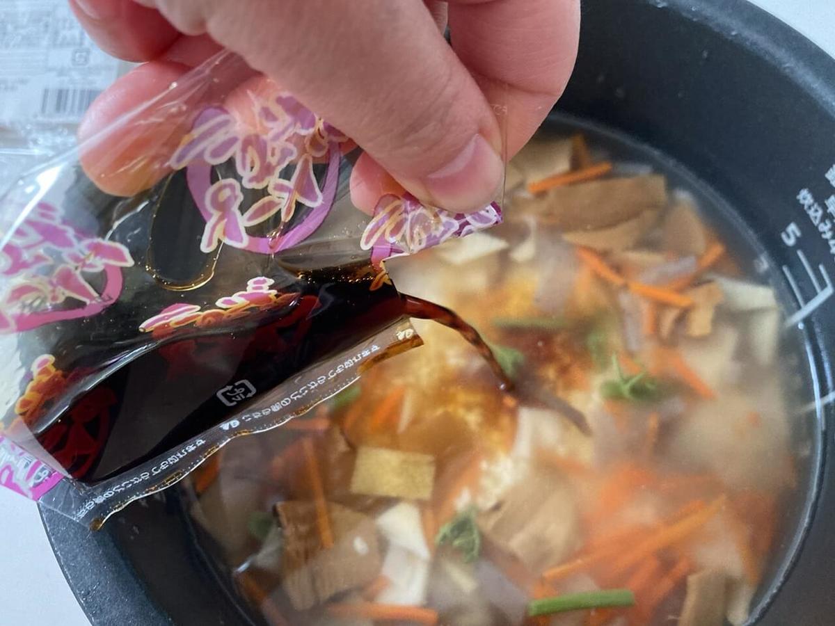 調味スープを加え、軽くかき混ぜて普通に炊き上げます。