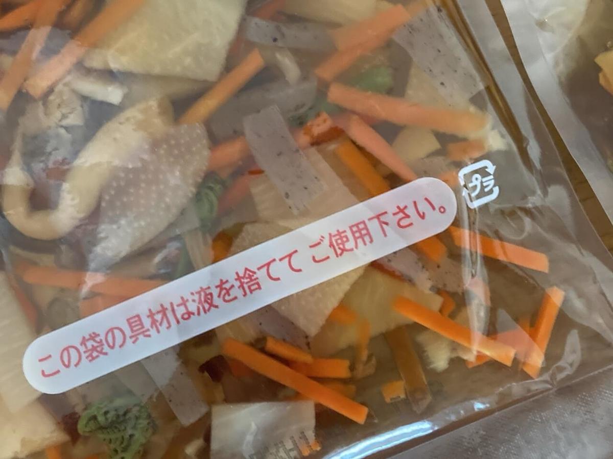 ラップをはがすと簡易トレーに具材の袋が2つ、調味液が1つ入っています。