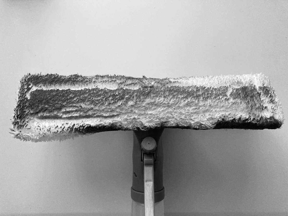 試しに外のガラスを1枚掃除してみると、こんなに汚れが!(お目汚し防止のため白黒加工しています)汚れ具合を見ても、モップ全体に均等に力が入っているのが分かります。