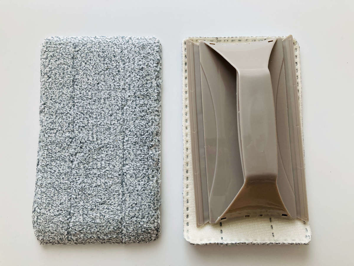 ダスターは2枚入りです。表面はグレーのふんわり素材、裏面は面ファスナーのようにザラザラとした素材です。