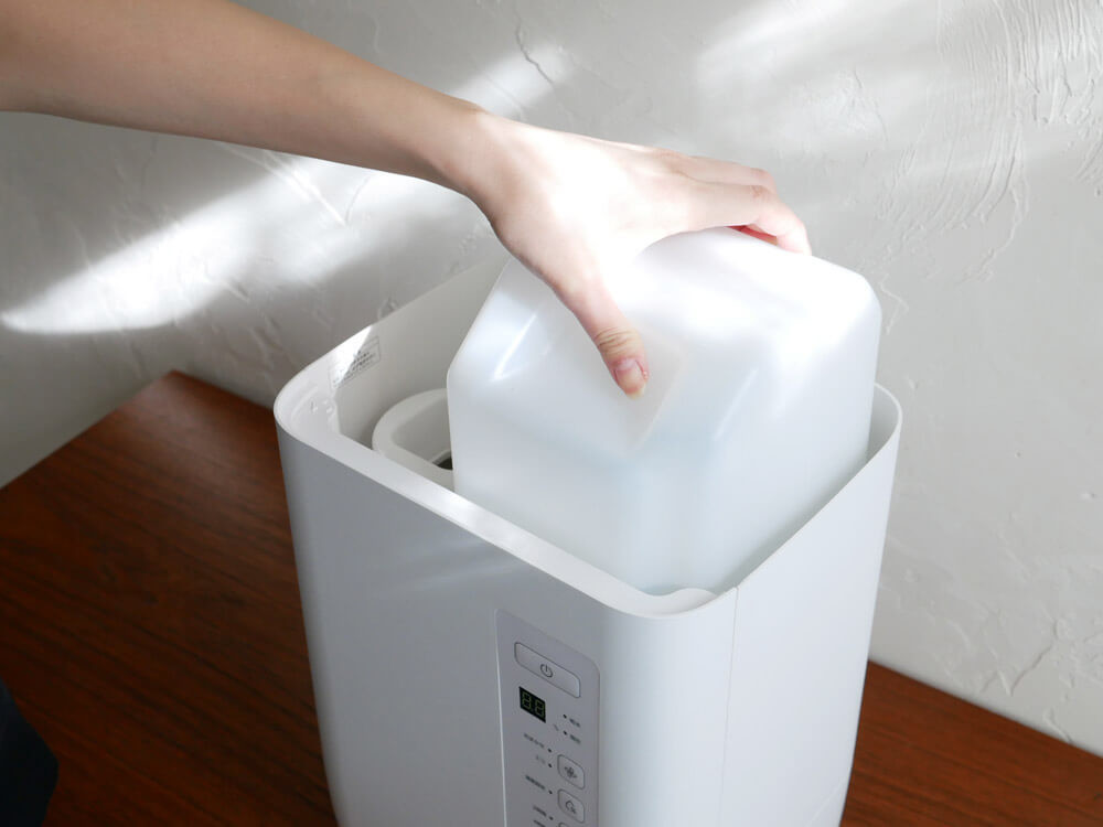 常温の水道水をタンクの満水ライン(タンク容量約4.5L)まで入れ、向きを正しく合わせて本体にセットします。