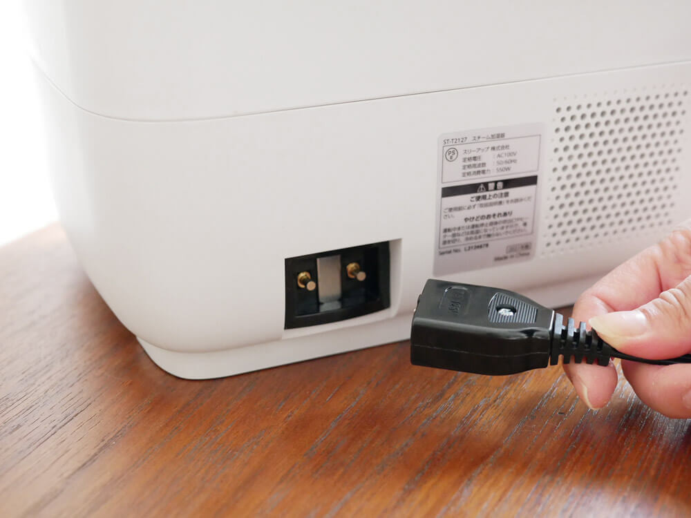 プラグ受けは本体背面にあり、コンセントはマグネット式。 万が一コードに足をひっかけても、簡単に外れるようになっているので安心です。