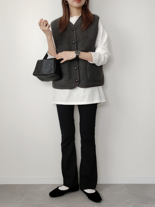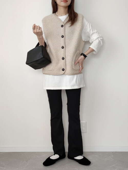 一つ前のコーディネートと同じスタイルから、ボアベストのカラーをチェンジ!