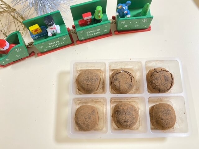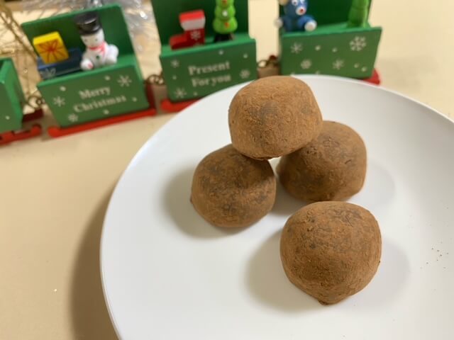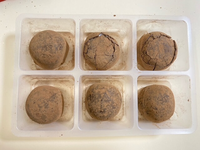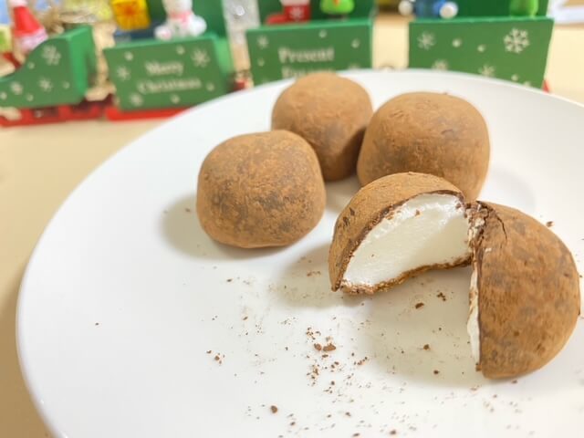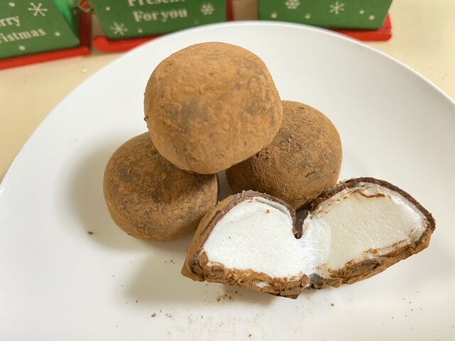 ましゅまろをチョコレートでコーティング。さらにその上からココアパウダーをまぶしていて、まるでトリュフのよう。