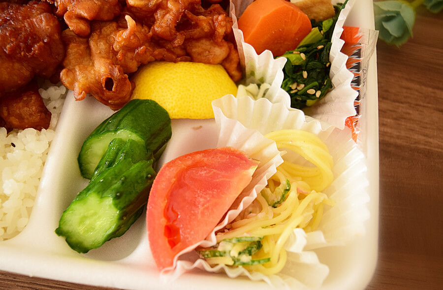 大きな唐揚げ5個と生野菜が入ってますね。お弁当にきゅうりの輪切りが入ってるのって、珍しいのでは?なんとなく、懐かしい感じのするお弁当です。