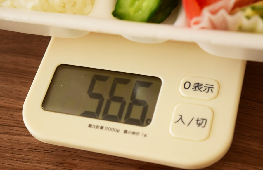 ハンバーグ弁当は容器代込で555gでした。野菜が多いのでもっと軽いと思ってました。