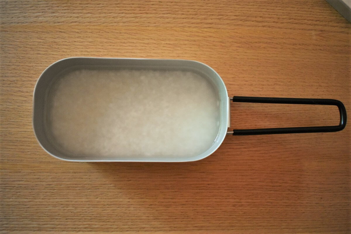 ダイソーのメスティンは1合用なので、約1合の米と適量の水を入れて、15分~30分浸透させます。