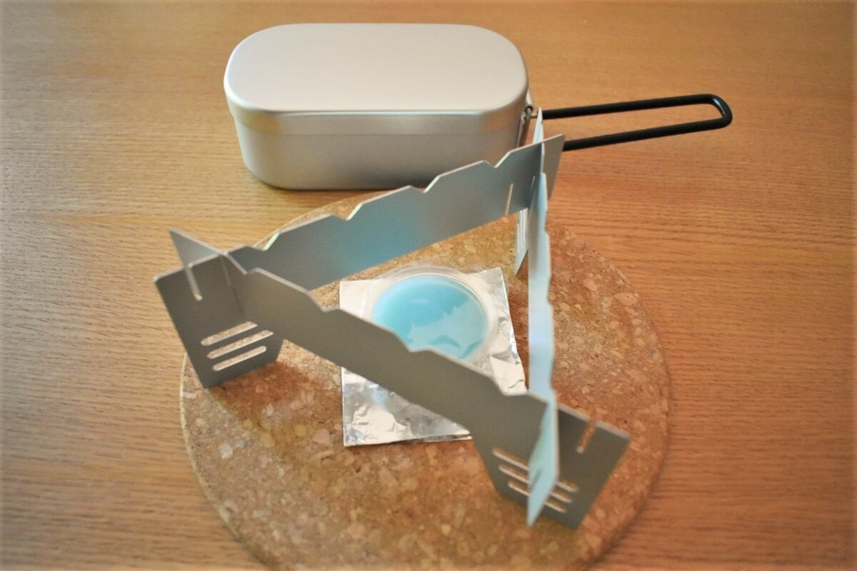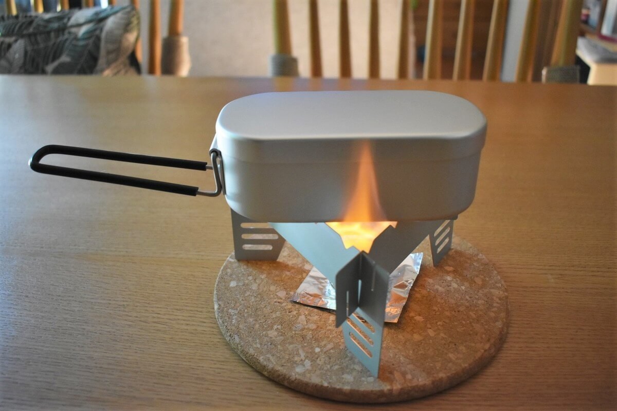 アルコールバーナー五徳と固形燃料をセットします。台の上には焦げ防止のためアルミホイルを敷いておきました。