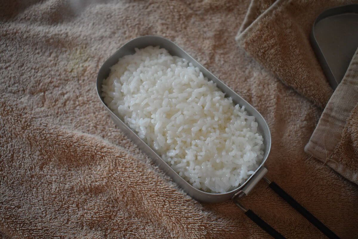 この時、説明書のとおり上下逆さまにしておくと、むらなく蒸らすことができるようです。通常の飯ごうと同じですね!