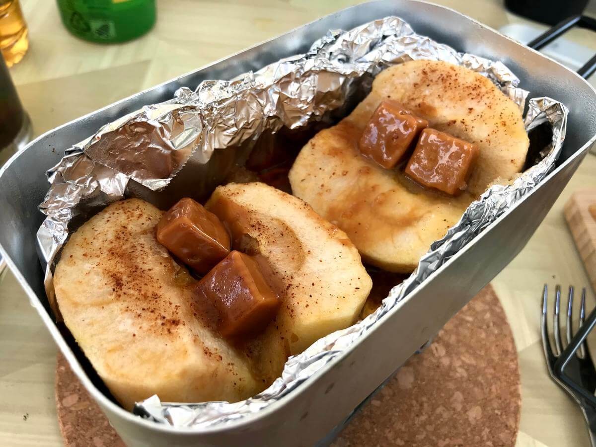 キャンプでごはんを炊いたり、パスタを作ったり、スイーツを作ったりと、熱伝導率が高いので、固形燃料などで火を入れれば簡単においしくお料理が完成します。