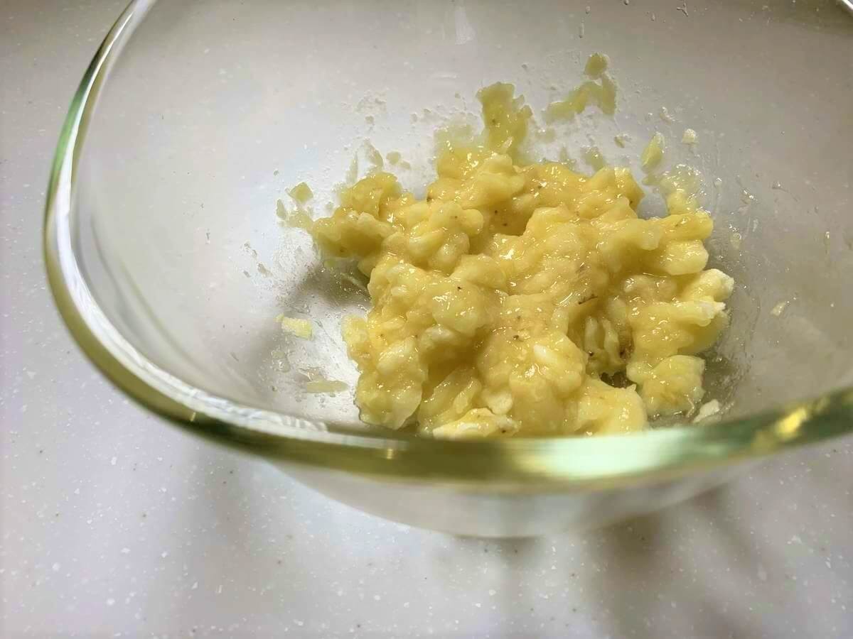 バナナの皮をむいたら器に入れ、フォークで潰します。