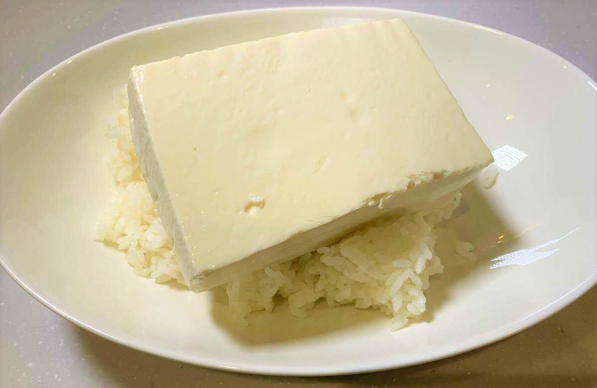 ご飯をお皿に盛り、水切りした豆腐をその上にのせます。