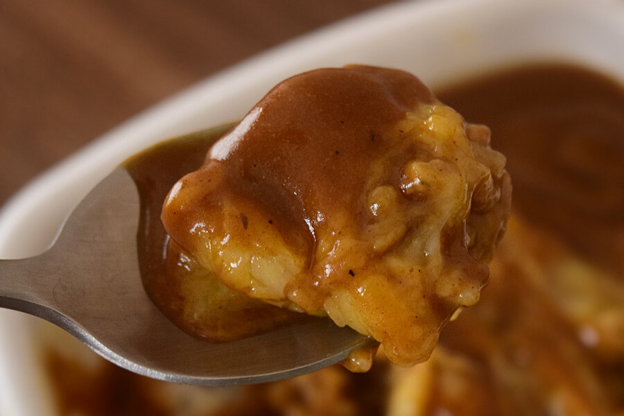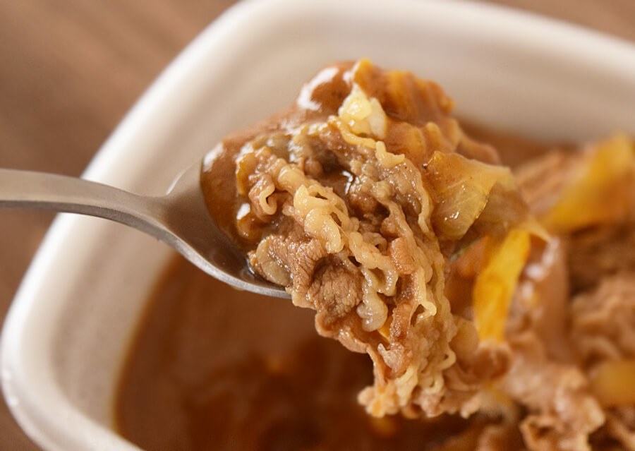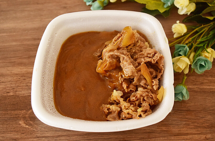 ごはんの上に、カレーもかけてみました。牛肉はやや少ない印象はあるものの、実食してみると、ちょうどいい分量でした。お腹ペコペコすぎて……といった状況でもない限り、お腹は満たされるはず。