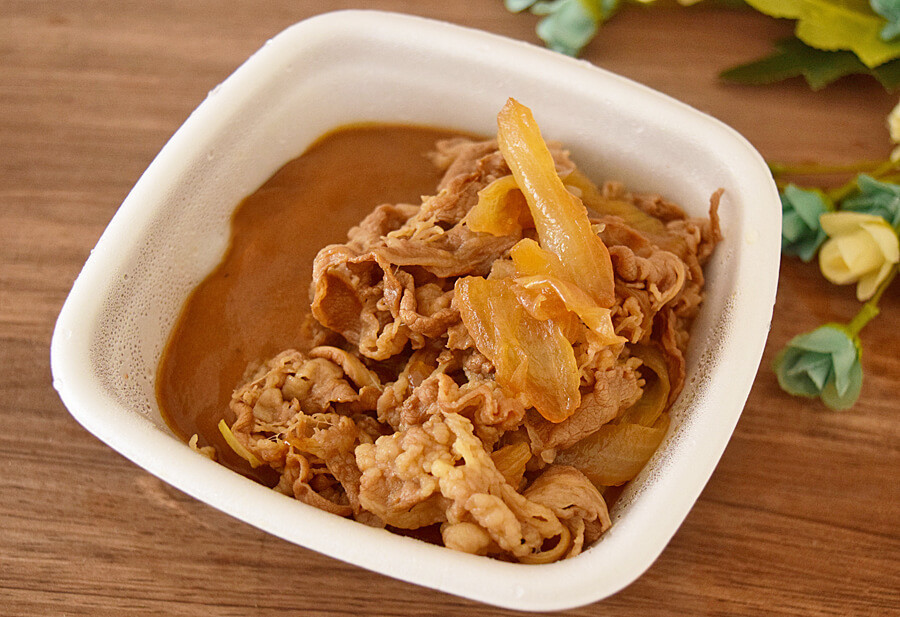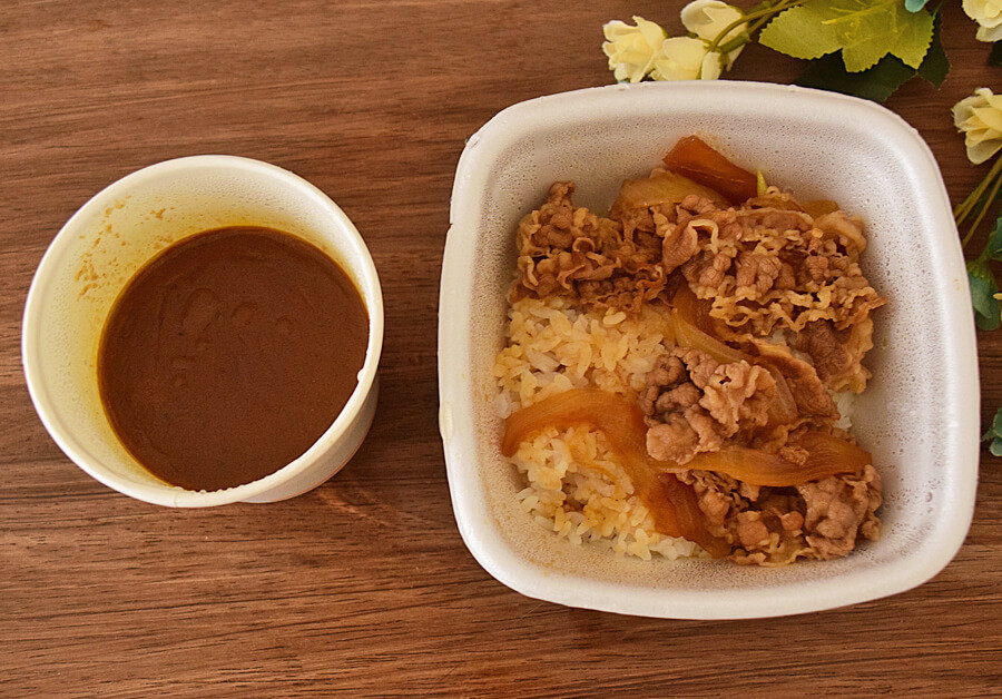カレーはドロッとしていますが、形のある具材は入っていません。公式の情報では「牛丼の牛肉・玉ねぎに合わせて鰹節の風味をきかせ、乳製品やりんご濃縮果汁、マンゴーピューレも使用」とのこと。