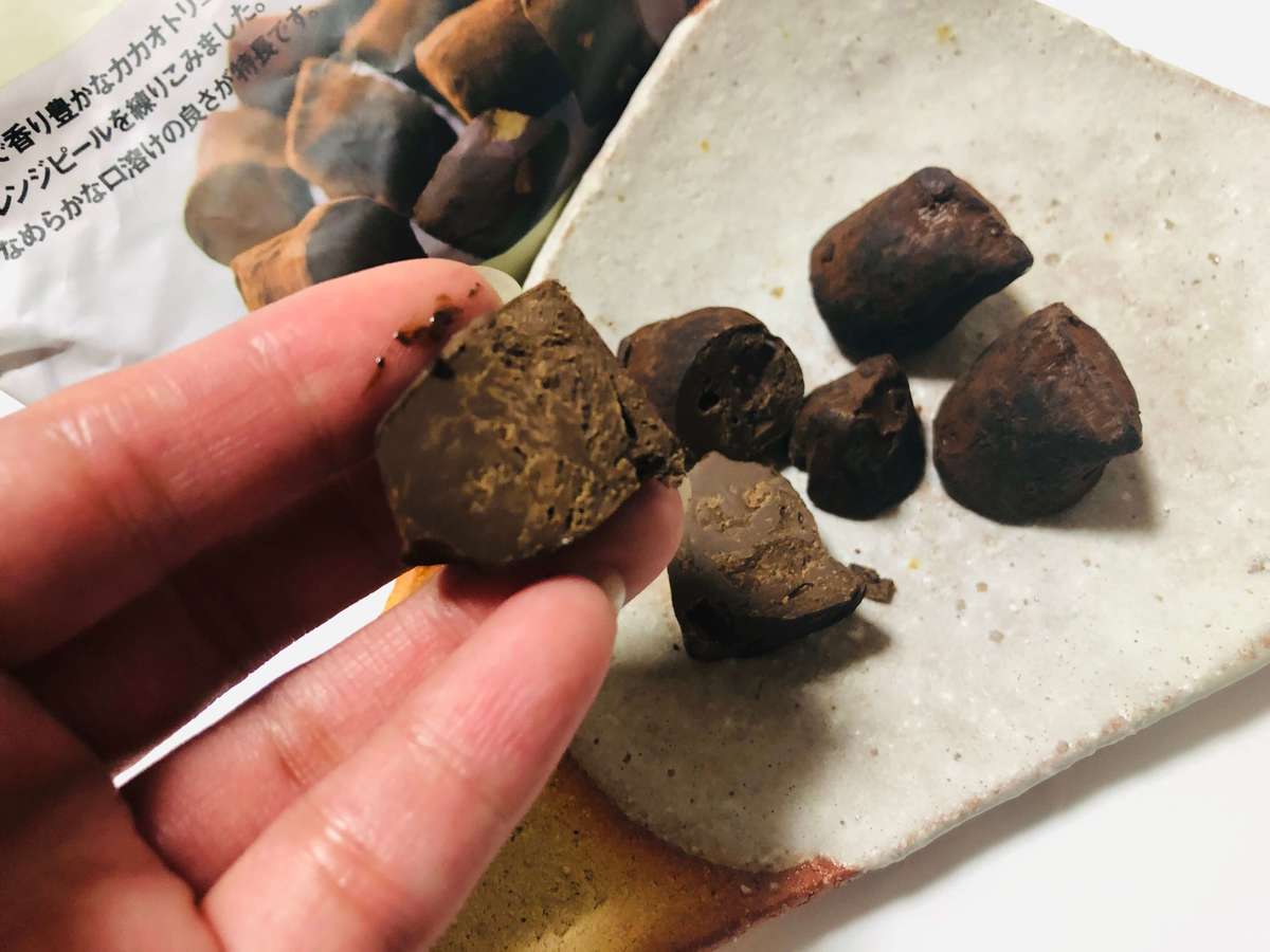 このトリュフは、オレンジピールが細かく練り込まれているので、舌触りがとてもなめらか。カカオとオレンジが口の中で絶妙に合わさって、大人な味わいに変化していきます。