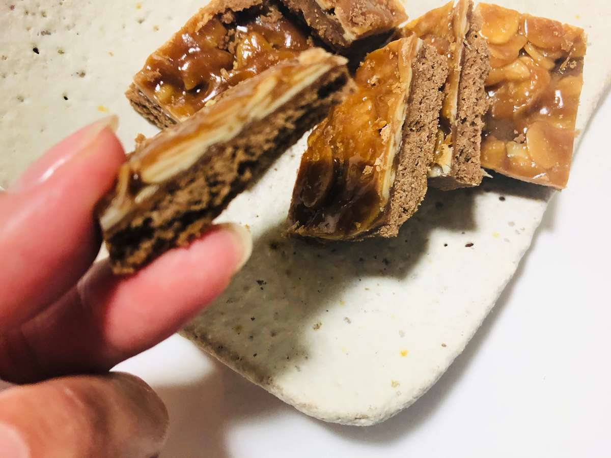 薄めのクッキー生地に、香ばしいナッツとチョコレートキャラメルの甘さとほろ苦さが絶妙で、一度食べるとヤミツキに!