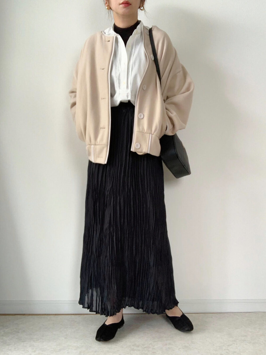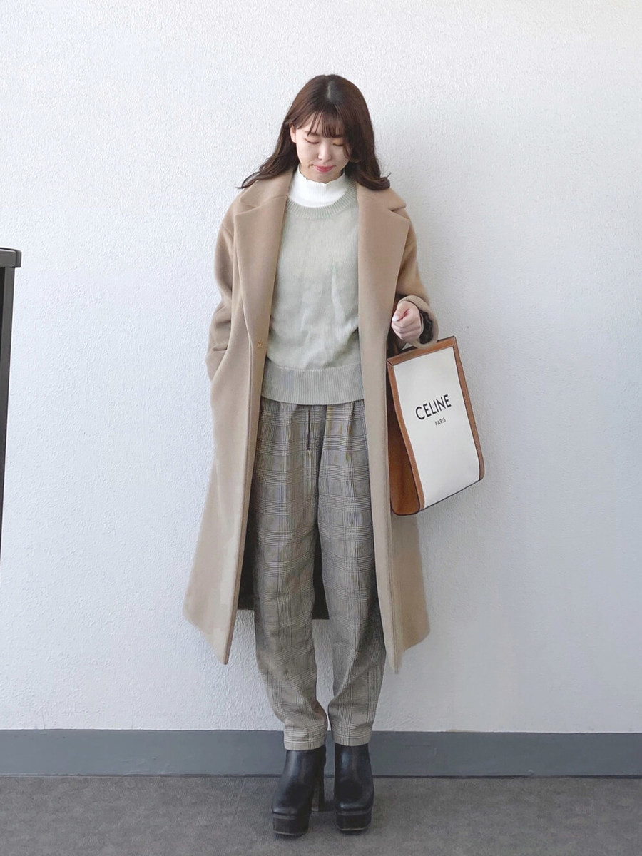 アウターでベージュを加えて、柔らかな印象のこなれた着こなしに仕上げています。