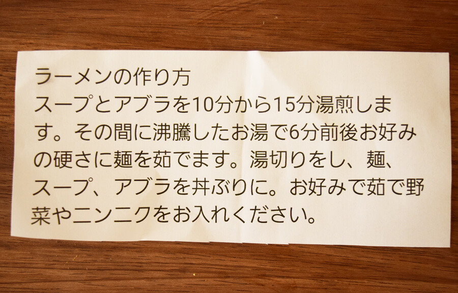 ラーメンの作り方は、紙に書かれていました。基本的にすべて湯せん調理。調理工程は簡単です。