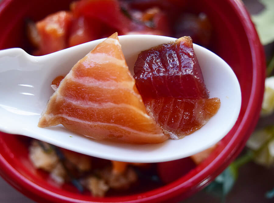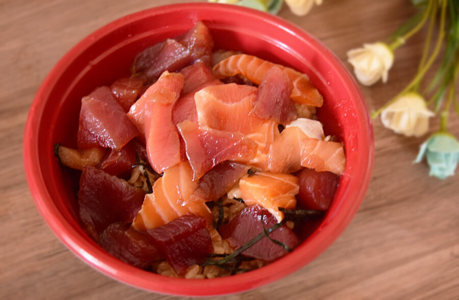 私が買ってきた「本日のまかない丼」は、漬けまぐろと漬けサーモンが入ってましたね。