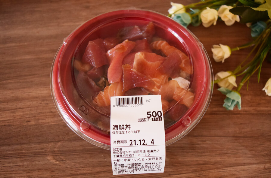 パッケージ帯には「海鮮丼」と明記されていますが、店頭では「本日のまかない丼」として並んでいました。