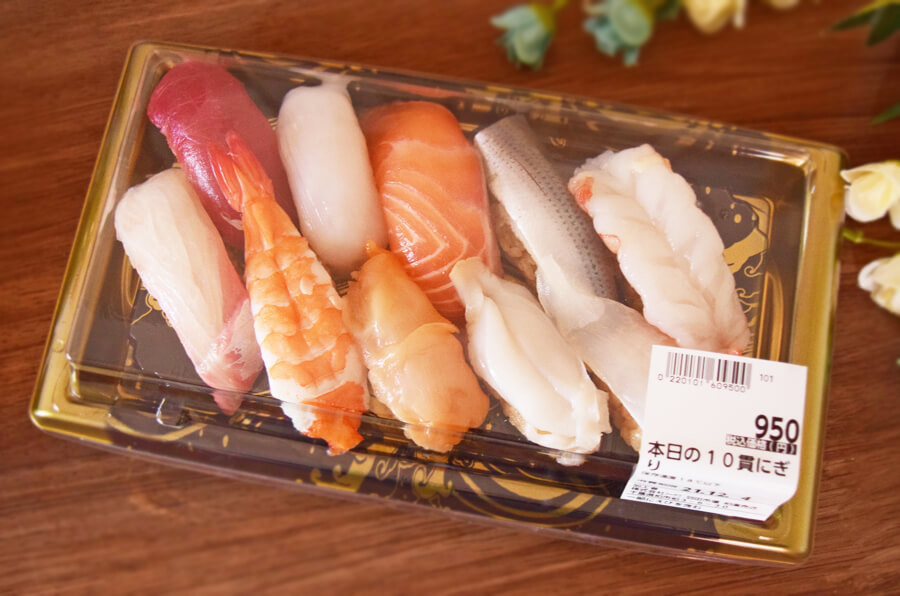 羽田市場「本日の10貫にぎり」は950円(税込)。1貫あたり100円以下なので、安い回転すし屋と同程度の価格です。10貫にぎりは、当日の水揚げ状況により産地やネタが変わるそうです。