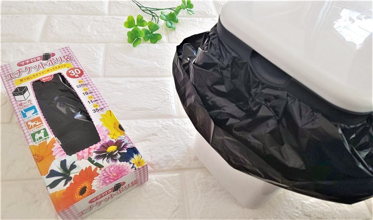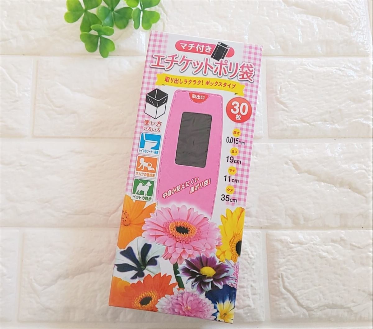 定番のブラックカラーの「エチケットポリ袋」は、サニタリー用品として常備しておきたい100均グッズの1つ。こちらも、取り出しがラクラク!ボックスタイプです。