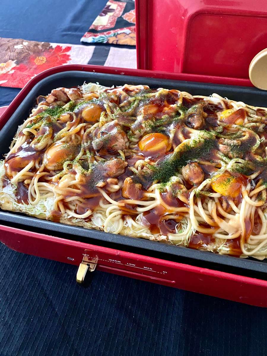 @haraguroteiさんはボリューム満点の焼きそば入りお好み焼きを作ってくれました。