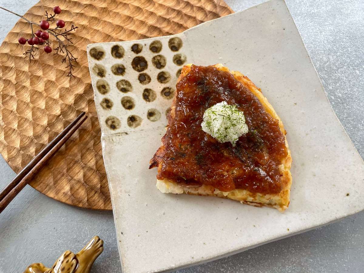 実はお好み焼きにはキャベツ以外の野菜もぴったり。余りがちな白菜を刻んで入れるとシャキシャキの食感が楽しめます。角切りにした豆腐を混ぜ込むと、ふわふわ柔らか~な生地に。 仕上げに「お好みソース」をかけ、大根おろしをのせます。