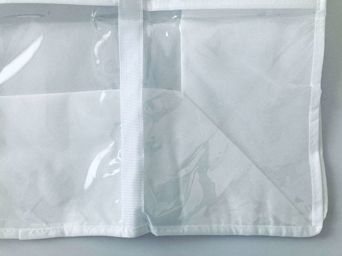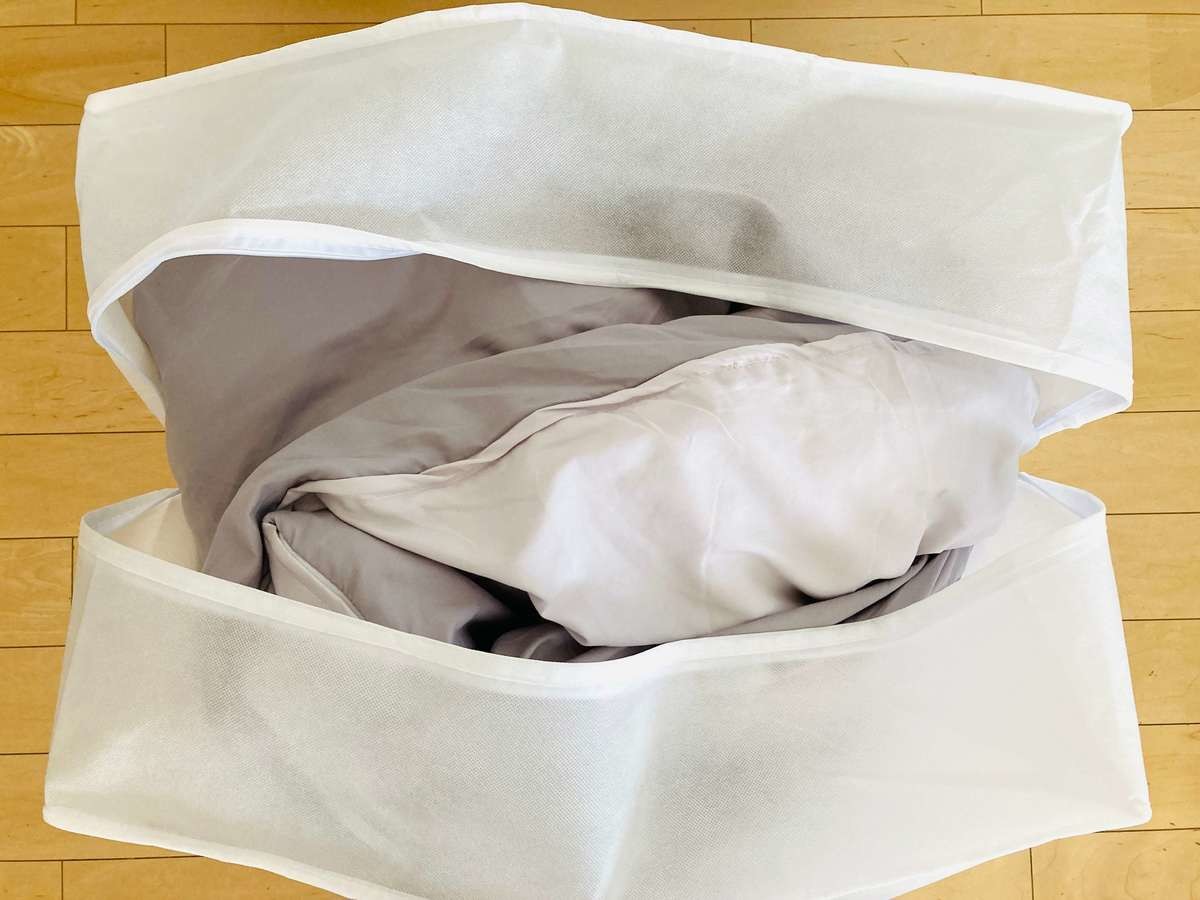 不織布は薄手ですが、パリッとしていて丈夫な質感です。しかも周りはパイピング加工がされているので、布団を入れても型崩れの心配がありません!押し入れの収納スペースもしっかり確保できます。