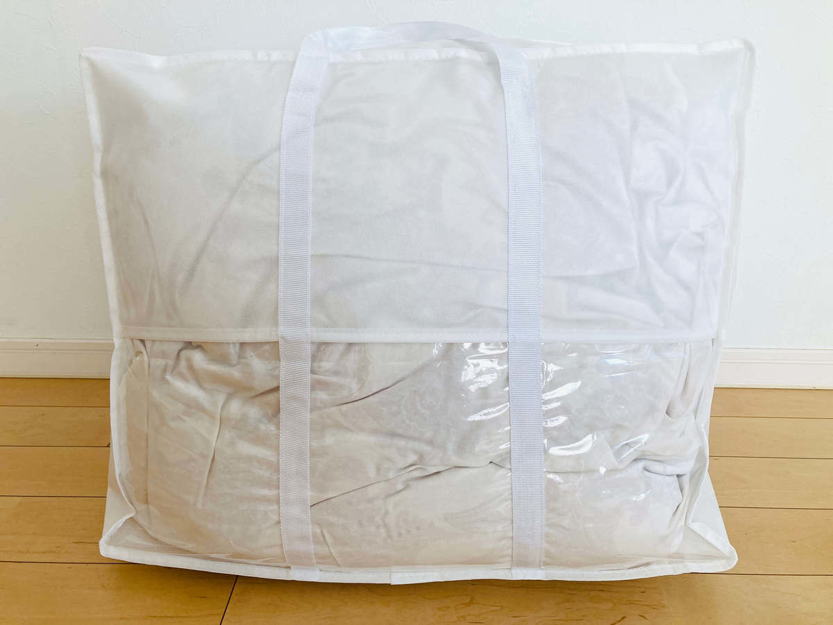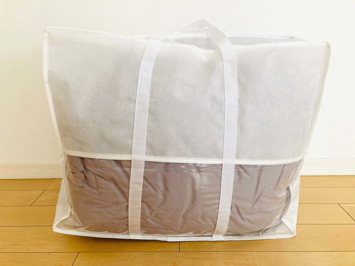 ふとん収納バッグは、不織布でできた大型の収納バッグです。何も入っていないときは薄くて軽いので、使わないときはコンパクトに片づけておけます。
