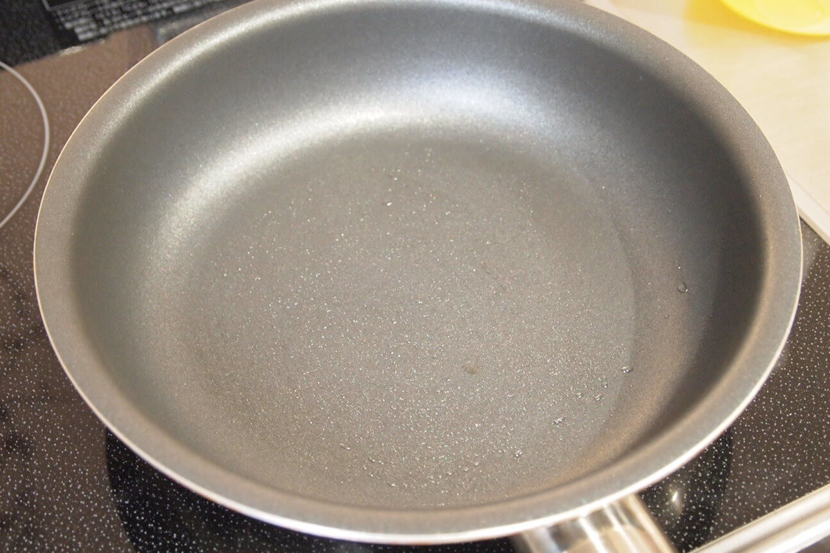 フライパンに薄く油を引いて、強火で1分程温めます。目安としては、水滴を垂らすとジュワ~っとすぐに蒸発する程度。