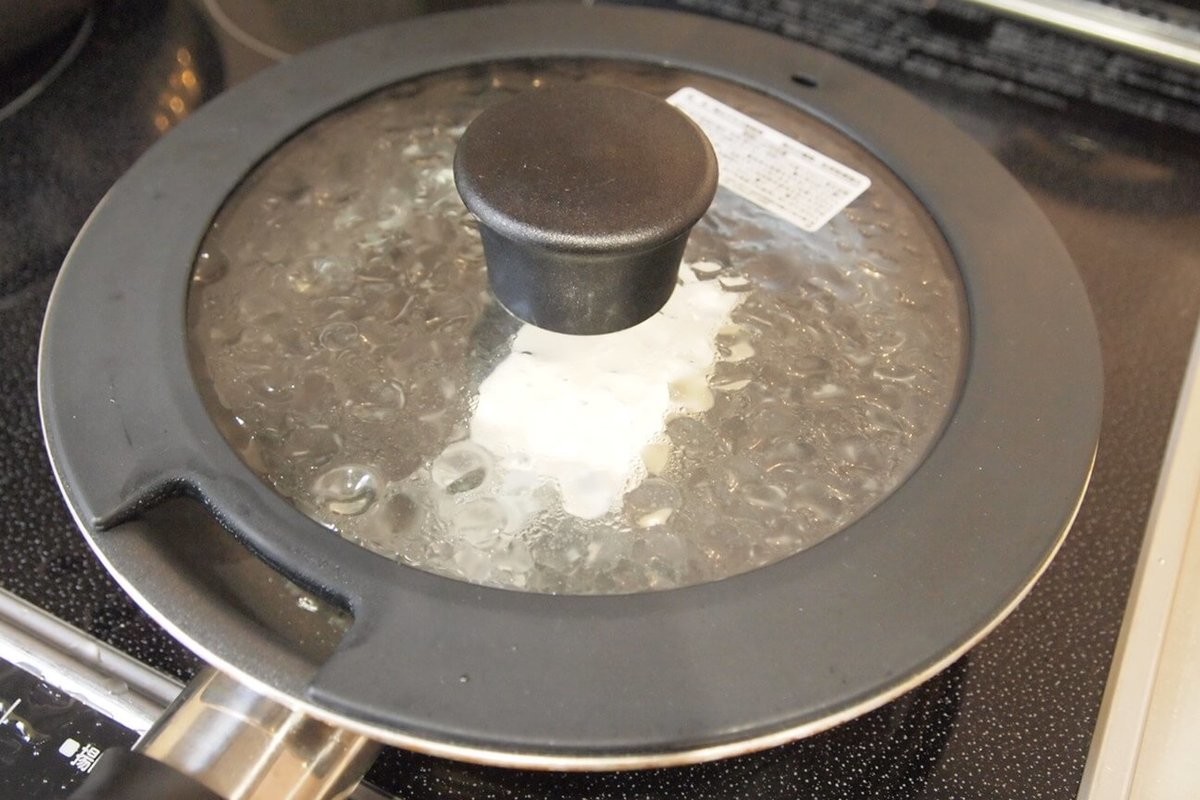 フライパンが温まったら、お餅(熱する面に水をつけておく)を入れ、80度以上の温かいお湯(または熱湯)を加えたら、素早く蓋をして「30秒蒸し焼き」にします。