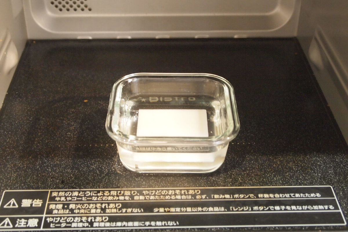 耐熱容器にお餅を入れ、お餅が浸るくらいの水を加えます。