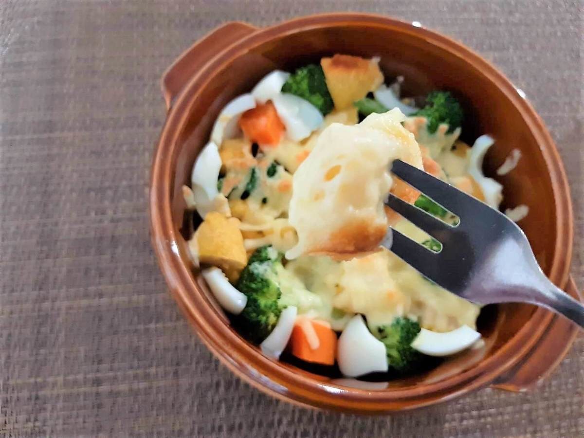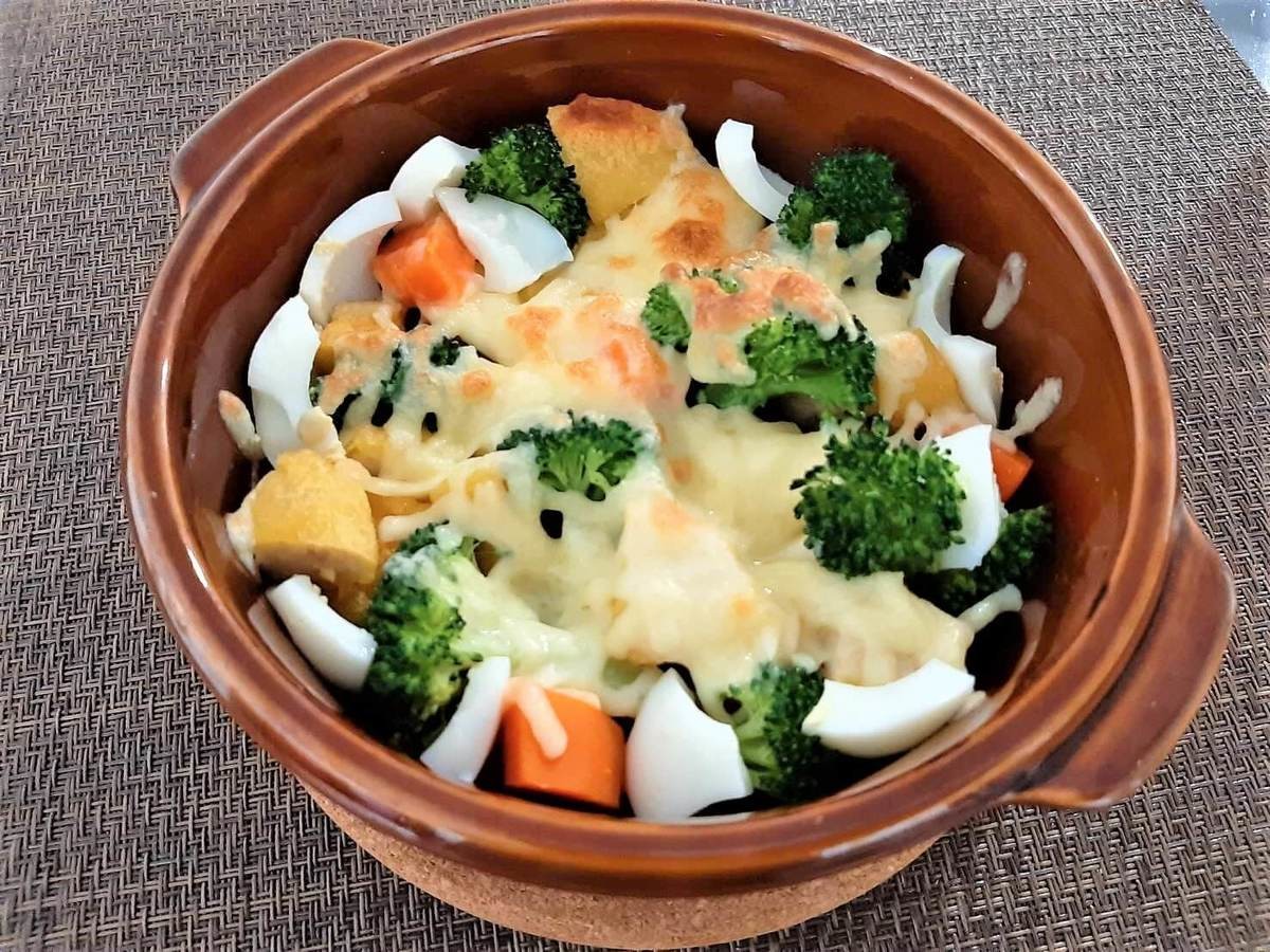 お皿に湯で野菜や茹で卵とともに並べて、上にたっぷりチーズをかけてトースターで焦げ目がつくまで焼くと完成です。