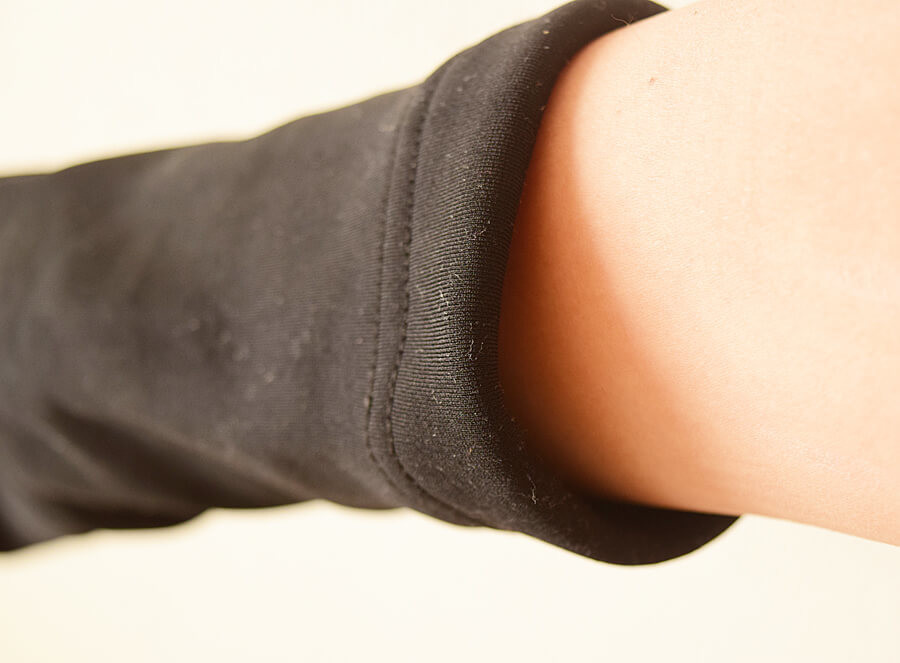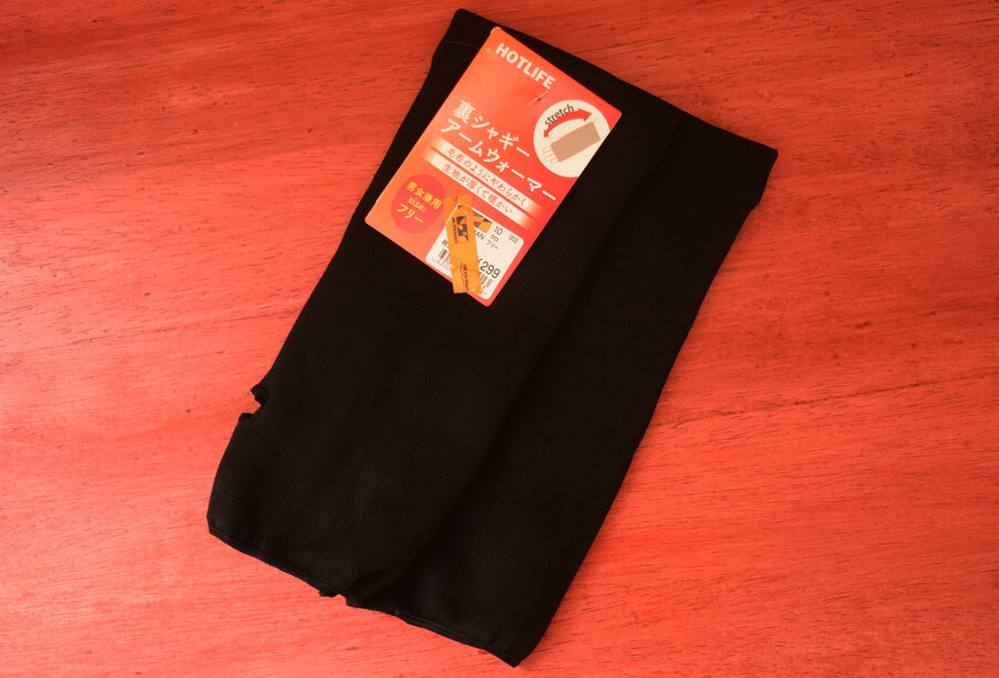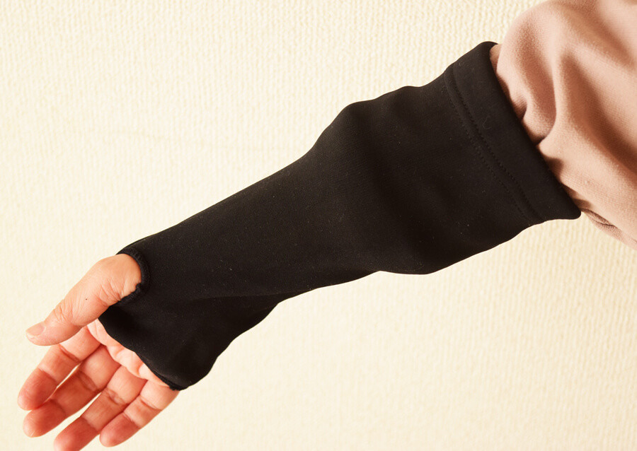 こんな状態で装着するシチュエーションはあまりないと思いますが、アームウォーマーで服を覆うように装着した方が、より密着度が増してあたたかさが保たれやすいのかなという印象です。