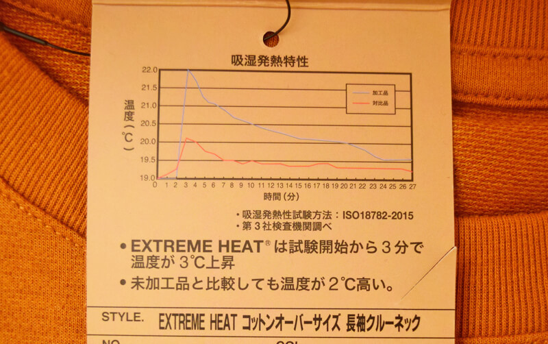 ふと洋服のタグをみると「未加工品よりも温度が2度高い」との記載がありました。着用前では「ふつうの薄手の長袖シャツとかわらないのに?」と半信半疑。