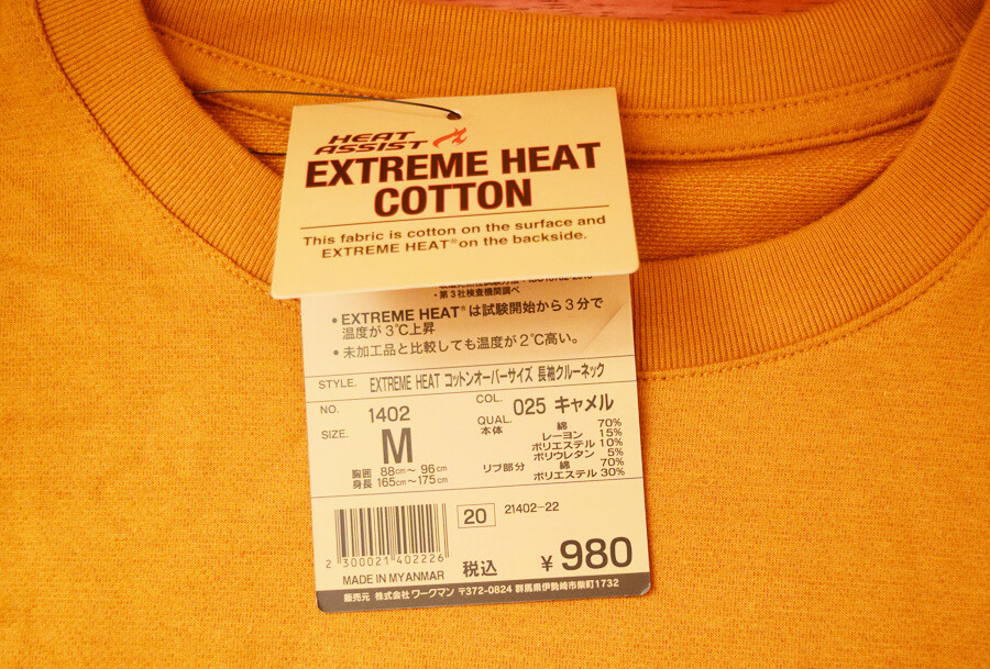 最後に、夫用として「EXTREME HEAT(エクストリームヒート)コットンオーバーサイズ長袖クルーネック」980円(税込)を買ってきました。