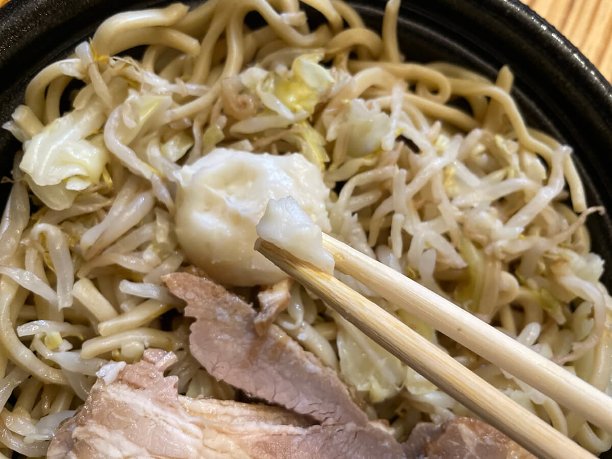具材がたっぷり入っているので、どこから食べても具が入ります。麺のシコシコ感と、もやしとキャベツのシャキシャキ感が合う!