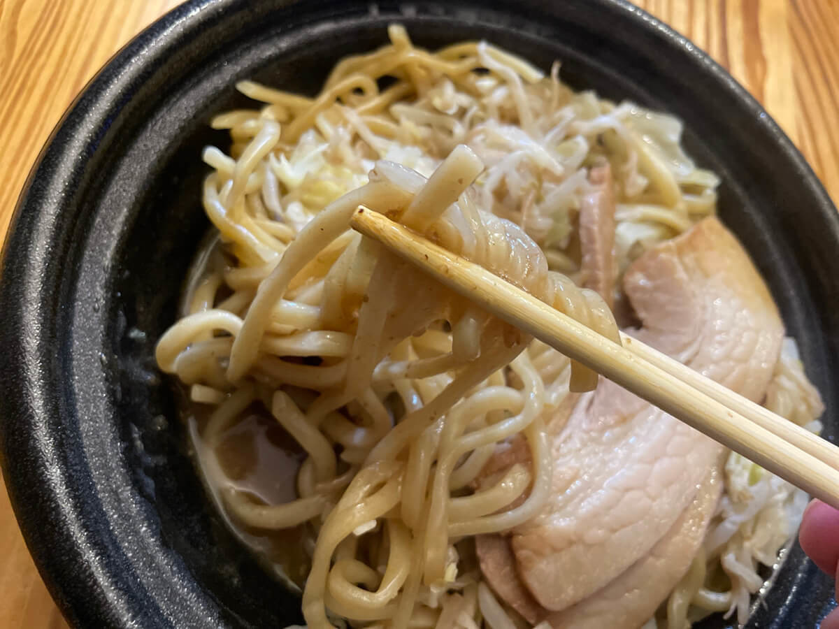 スープはとろみがあり、まるであんかけラーメンのよう。太麺にしっかりと絡みつき、濃厚な味わいです。豚醤油という名の通り、豚骨の独特な香りと風味に醤油が入ってまろやかな仕上がりに。
